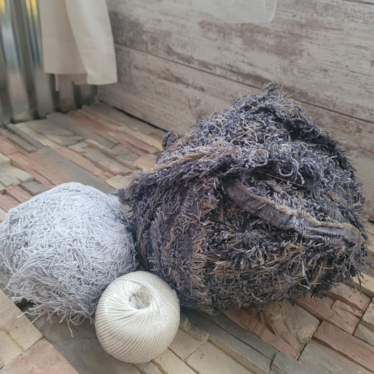 A collection of warp and weft materials for weaving. Handspun rug and art yarn. Raw and washed wool locks, natural colored and dyed. Cotton twine for warp. Denim and cotton fabric strips ready to weave in continuous strips. Even some baling twine for your rugged outdoor rug needs.