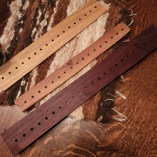 A collection of tools to aid the fiber artist in weaving and other fiber arts. This collection includes carrying cases, niddy-noddys, swifts, weaving combs, warp minders, and needles, along with other fiber tools to get the beginner weaving started and keep the experienced weaver going. Most of these tools are created from the same hardwoods as our peg looms, and are all hand crafted in small batches by local artisans.