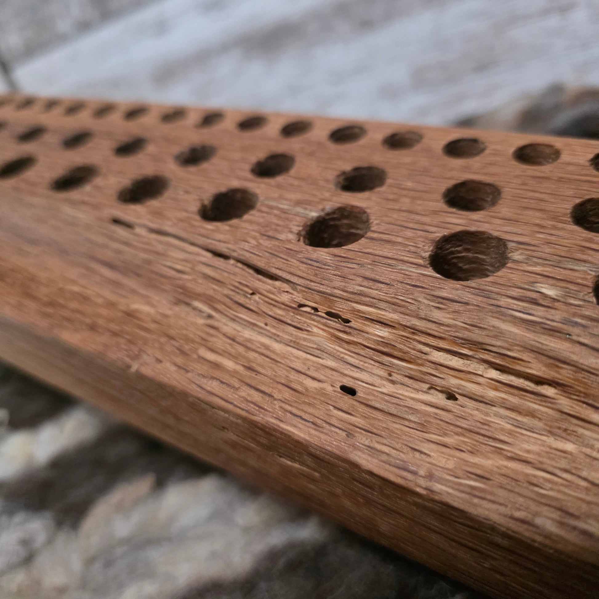Our Oak Goldilocks Peg Loom Kit features our favorite wood species, oak, known for its strength and durability. As a readily available hardwood in the Midwest, it was a top choice for building barns decades ago. Today, we continue to reclaim oak (both white and red) and feature it frequently in our inventory. These woods have stunning natural character and each board is very unique! Available standard in 24" and 36", with custom sizes available upon request.