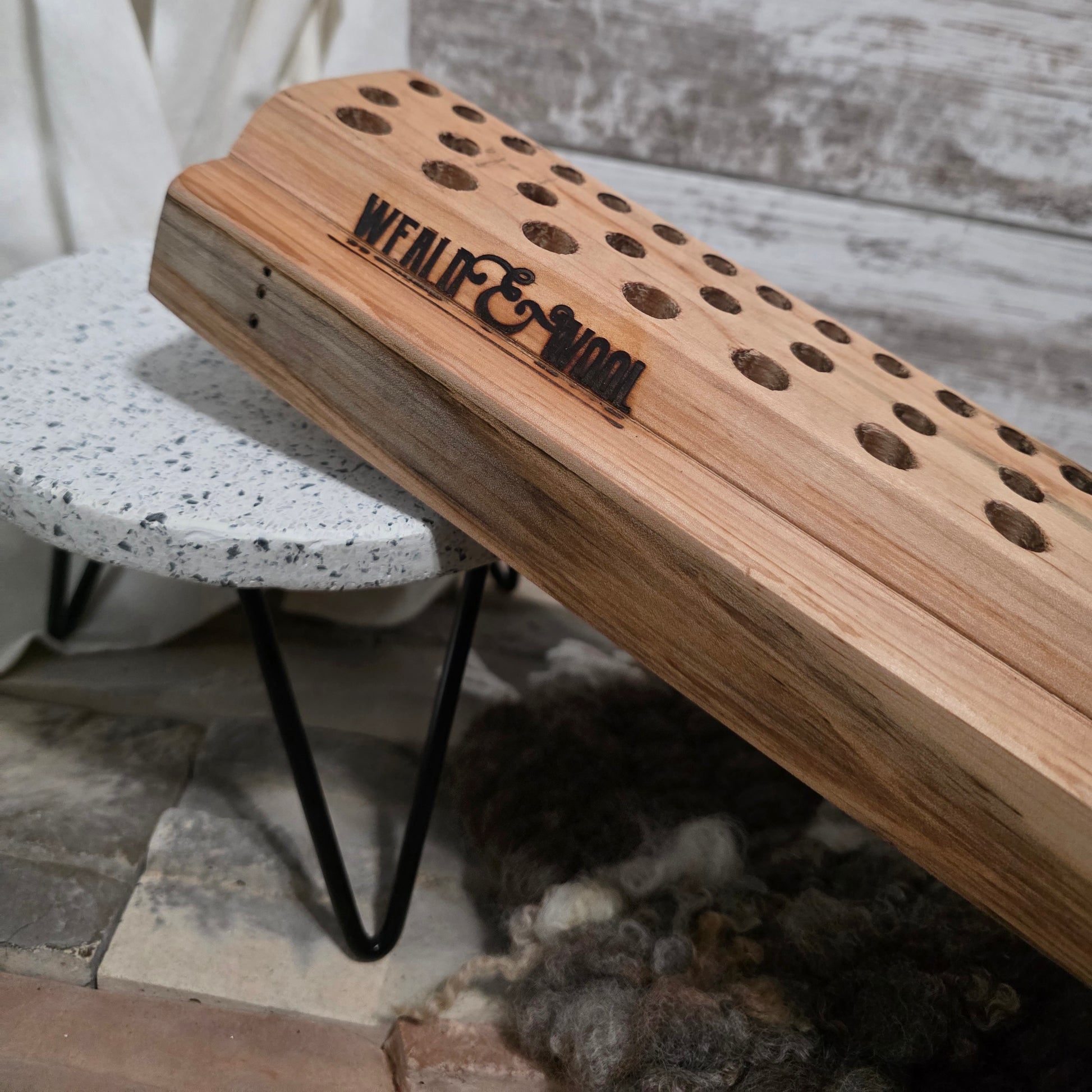 Featuring three rows of pegs, it offers the ultimate flexibility for all your project needs. The first row is perfect for lighter weft such as yarn, the middle row (which is the standard size on The OG) is ideal for roving and locks, and the last row is designed for heavier weft like corespun.