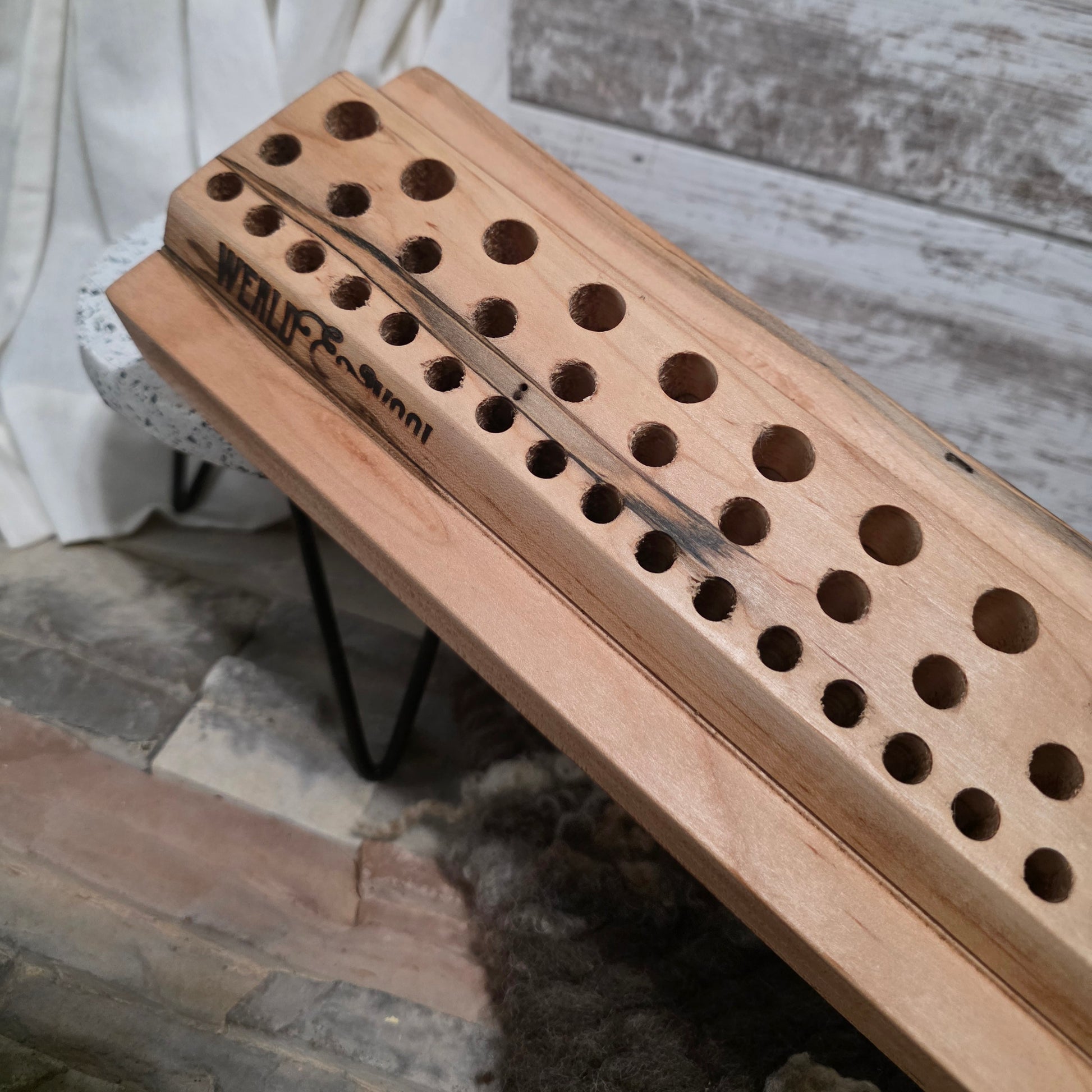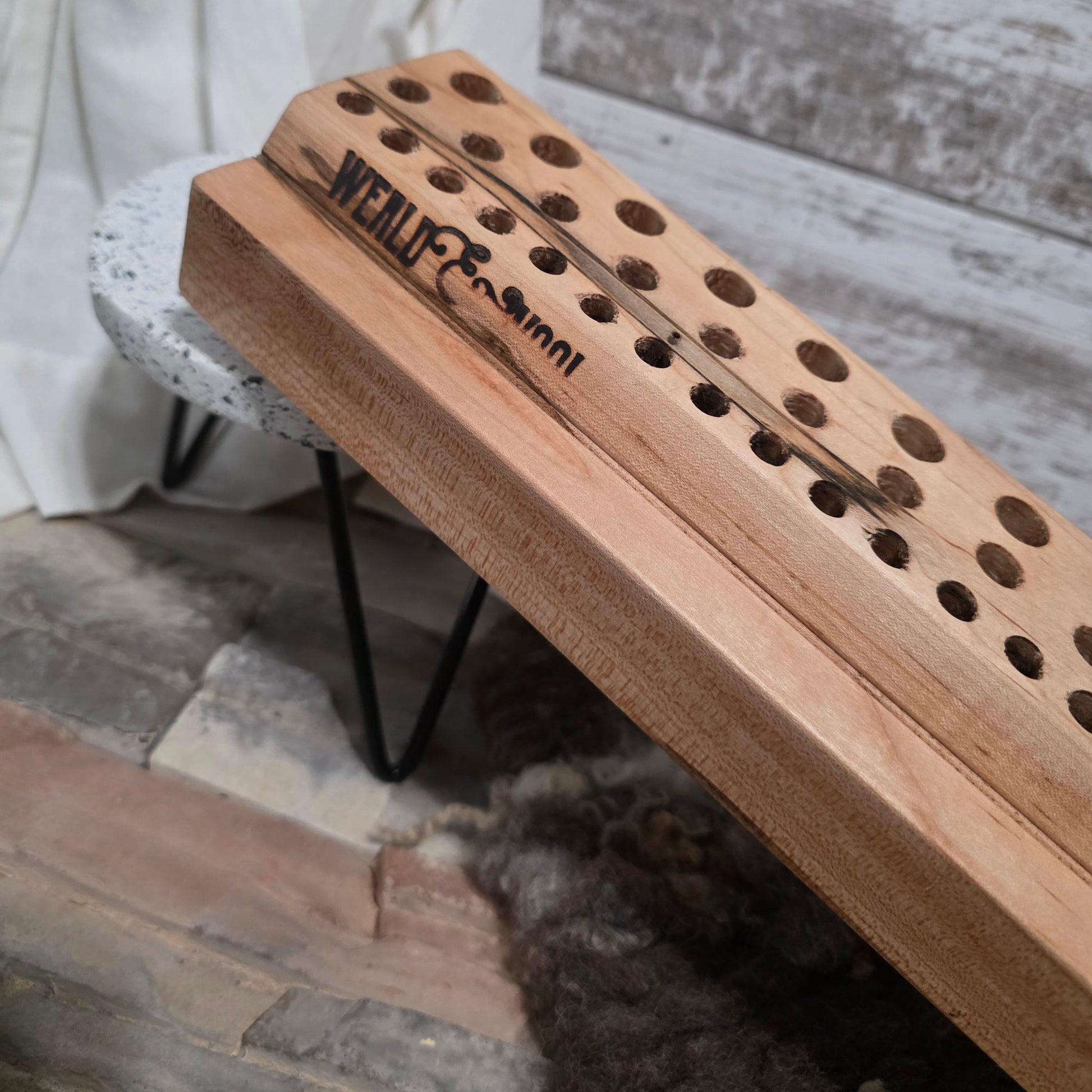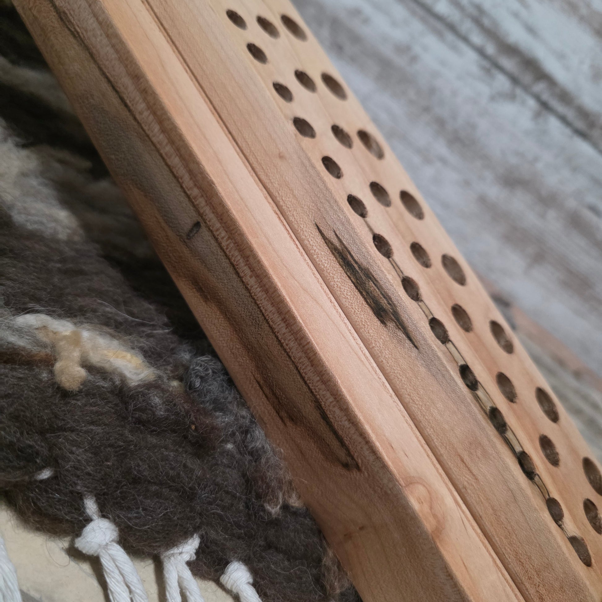 Our Ambrosia Maple Goldilocks Peg Loom showcases the simple beauty of maple, light in color and gently pleasing to both the eye and the hand...but that has been marred beautifully by the ambrosia beetle which left behind signature holes and grey streaks through the heart of the wood. Each flame of grey is unique, making each of these looms truly unique.
