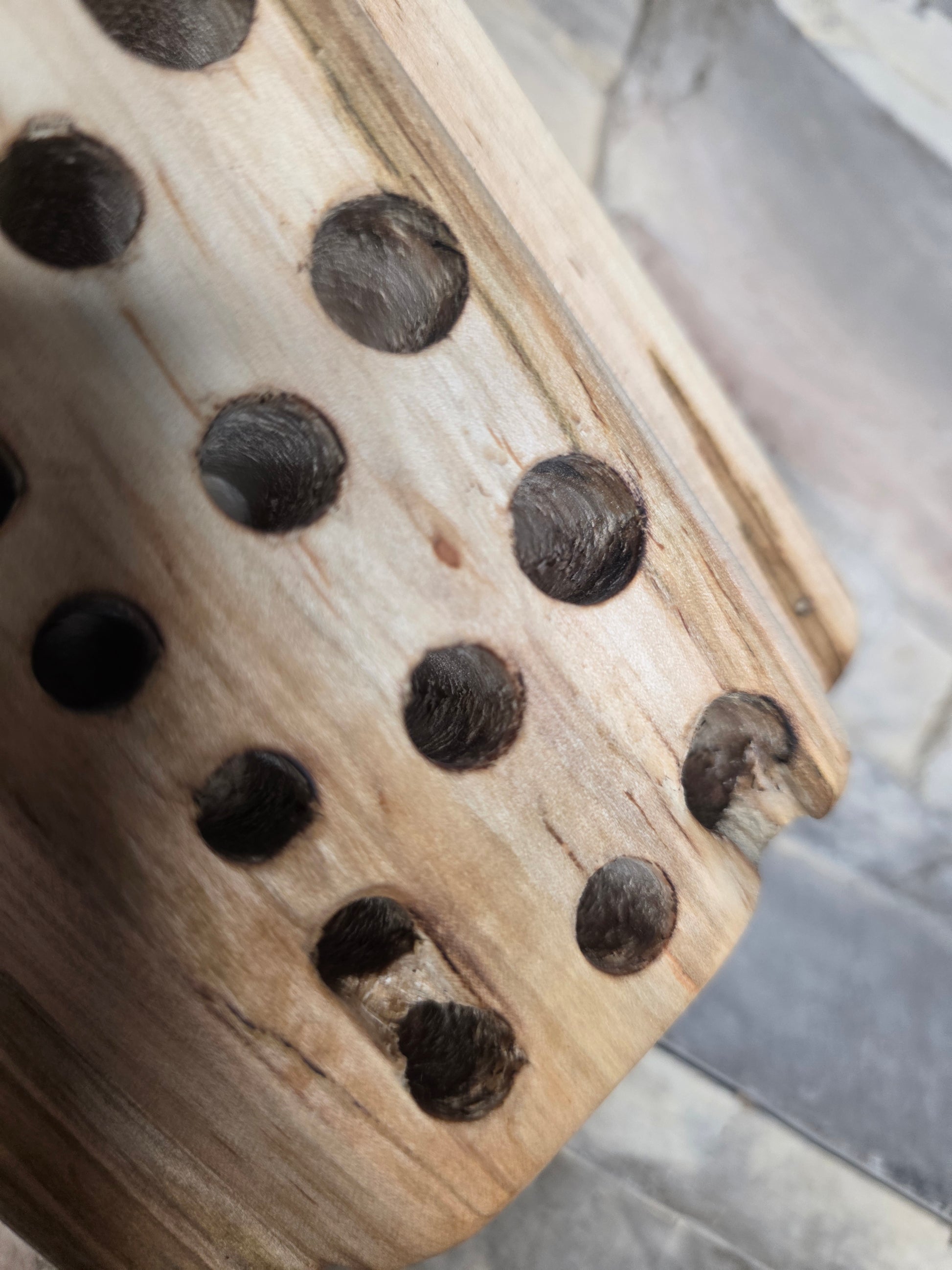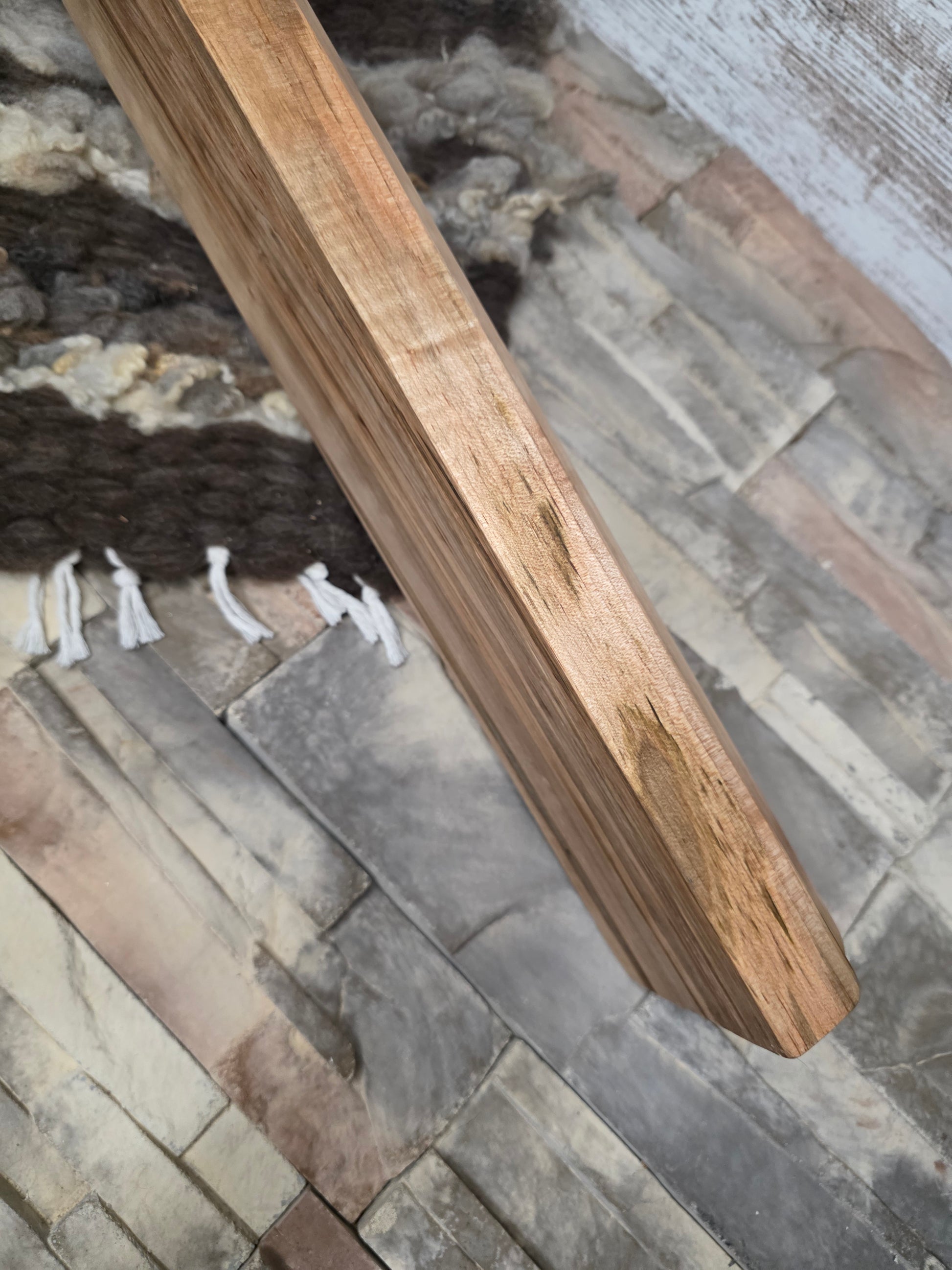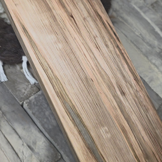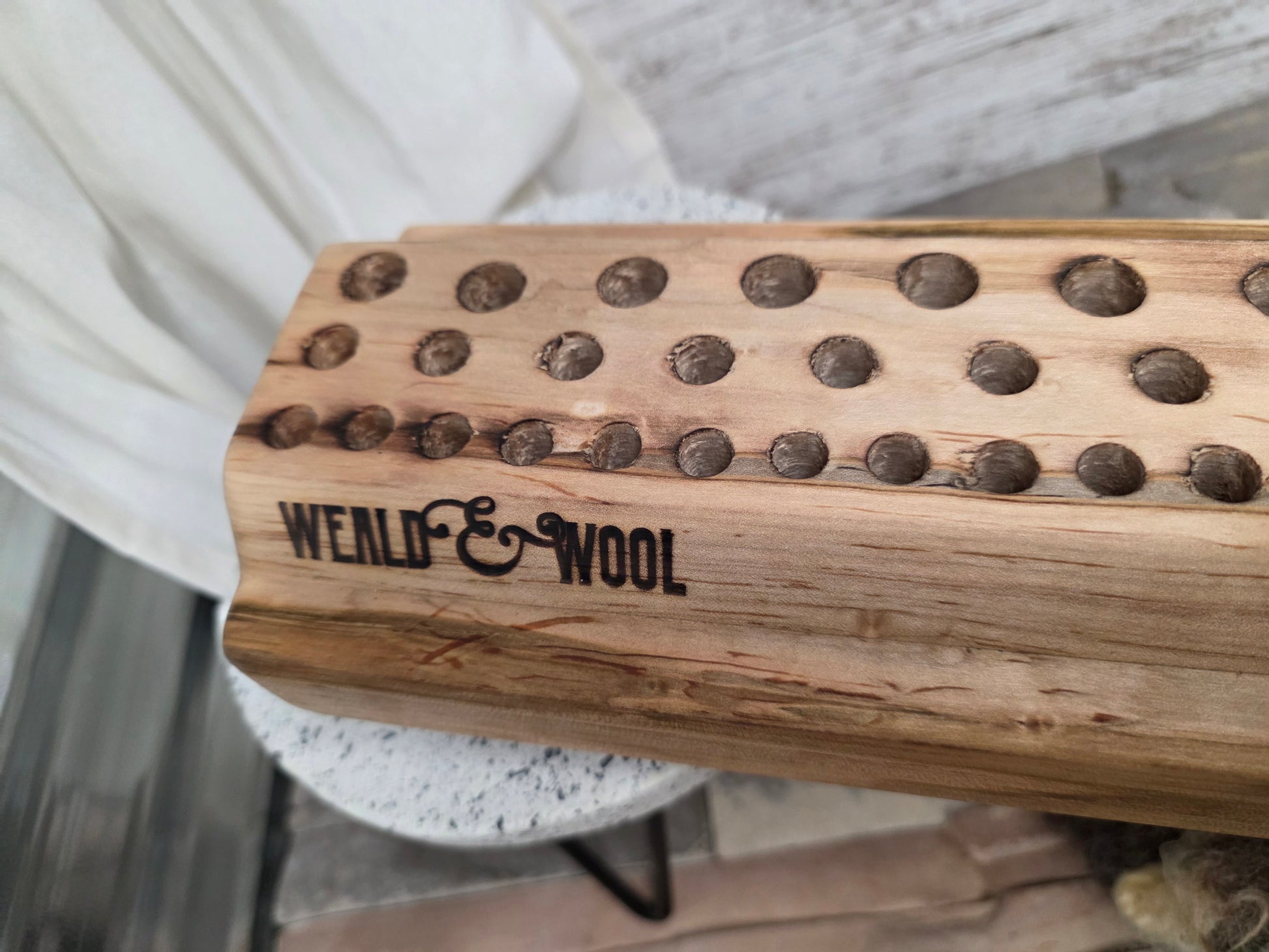 Our Ambrosia Maple Goldilocks Peg Loom showcases the simple beauty of maple, light in color and gently pleasing to both the eye and the hand...but that has been marred beautifully by the ambrosia beetle which left behind signature holes and grey streaks through the heart of the wood. Each flame of grey is unique, making each of these looms truly unique.