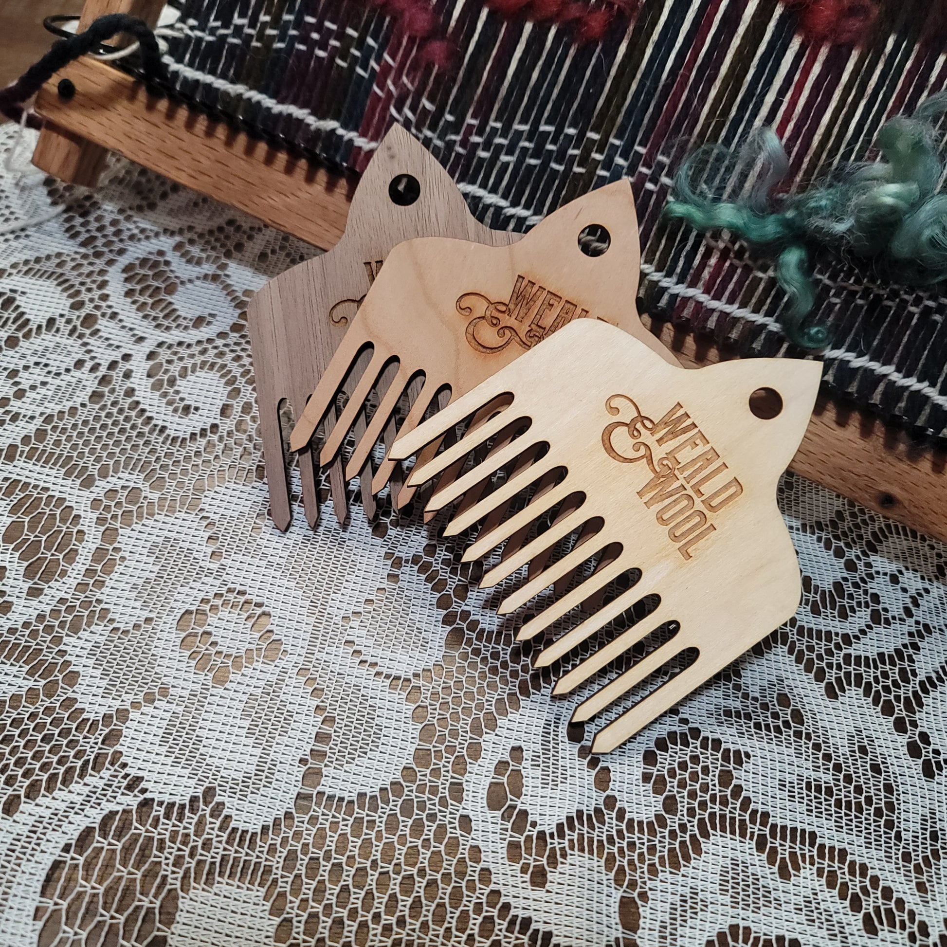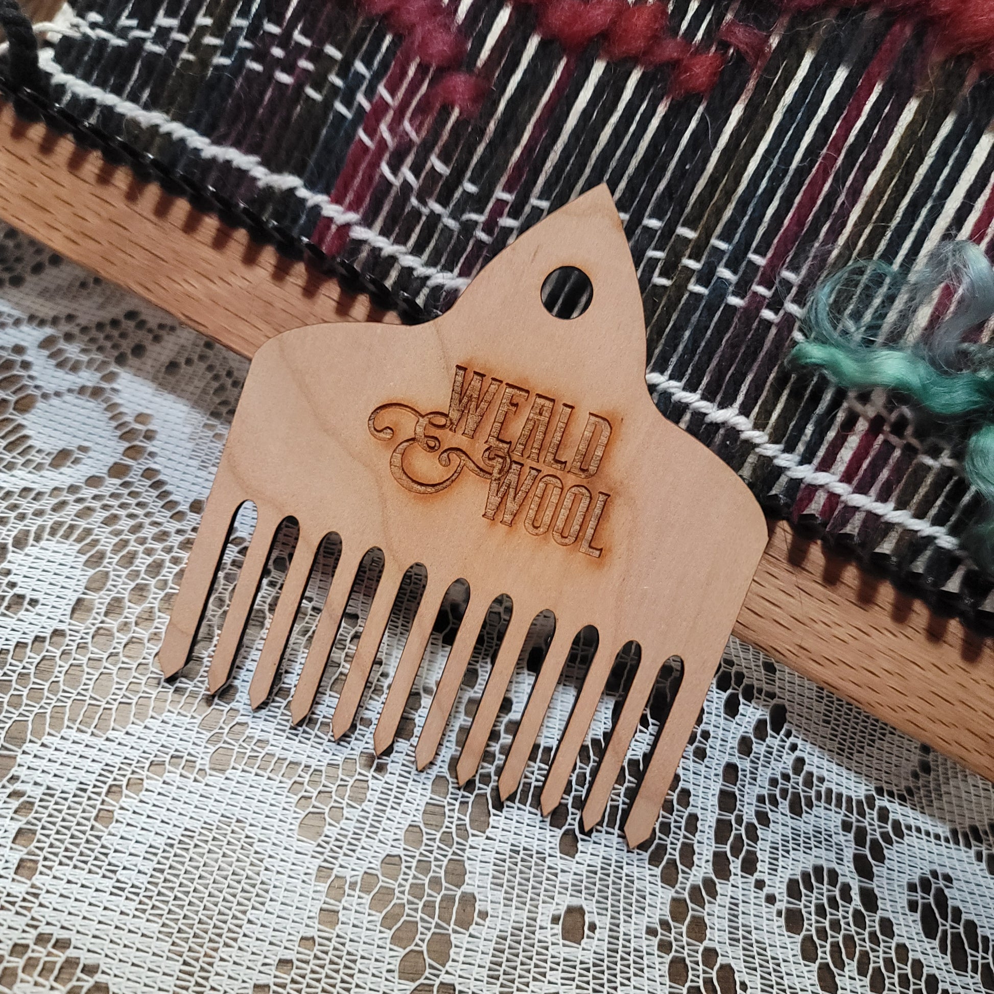 Our beautiful hardwood wool weaving combs will elevate your tapestry weaving to the next level! Use these combs to tamp your weaving down into place, locking your weft fibers where you want them. Use the pointed pick at the top to pick out fiber when you change your mind. A good size hole near the top allows you to hang your comb nearby, or use the included a strip of leather to create a loop for hanging.